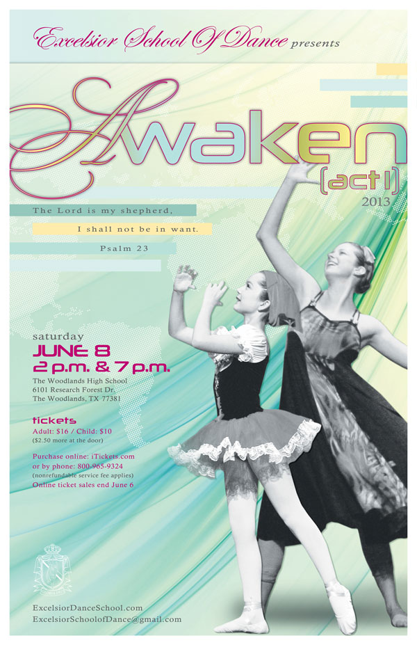 It's that time! Excelsior School of Dance is having their end of year performance. Awaken (Act 1) on SAT, 8 June at The Woodlands High School on Research Forest. Shows at 2pm and 7pm. (I recommend the evening performance because two of Bug's dances will be in that show. Most of the elder girls' dances will be in both shows.)